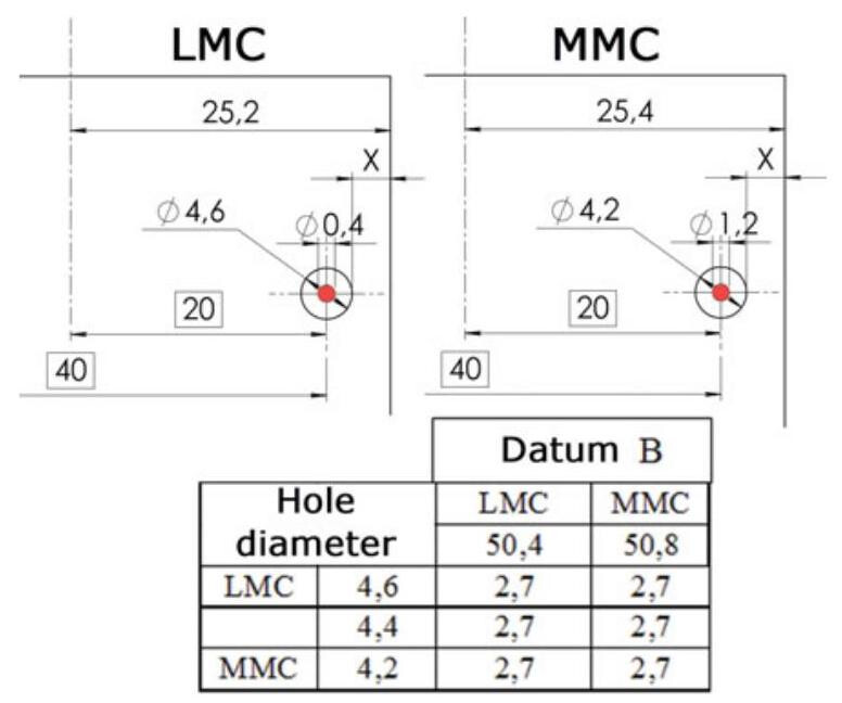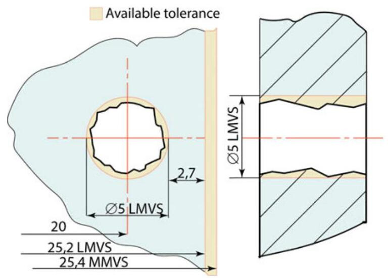 Again, in this case, when different conditions from the LMC are available, an increase in the form and location tolerances can be made that is equal to the difference between the actual dimensions and that of the least material.