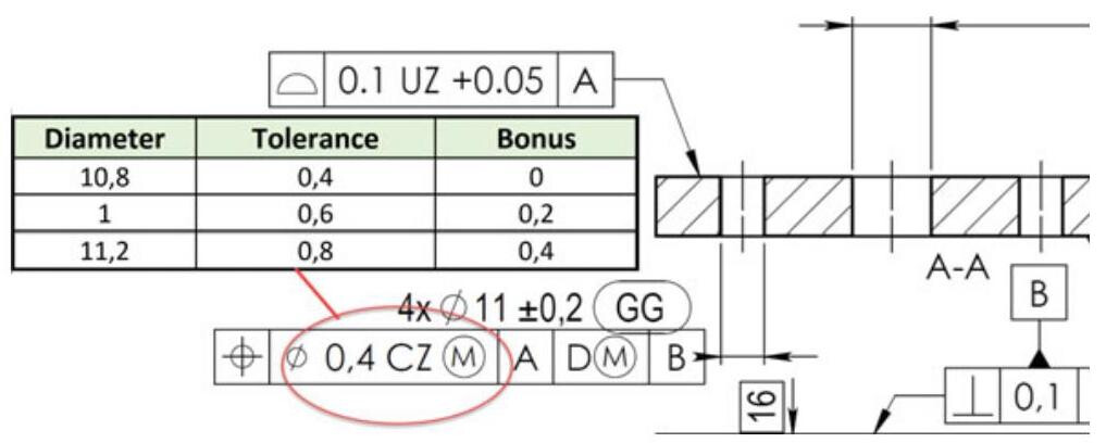 Fig. 5.2 An increase in the location tolerance (Bonus) due to the presence of the @modifier for the component shown in Fig. 3.1. The increase is equal to the difference between the measured dimension and the maximum material dimension