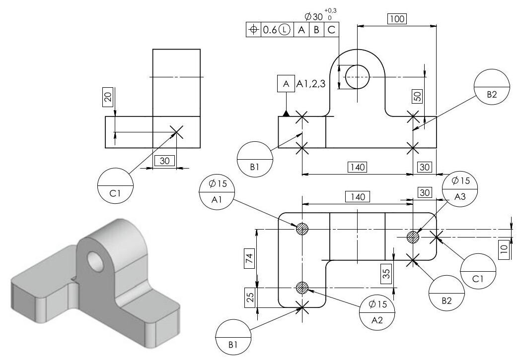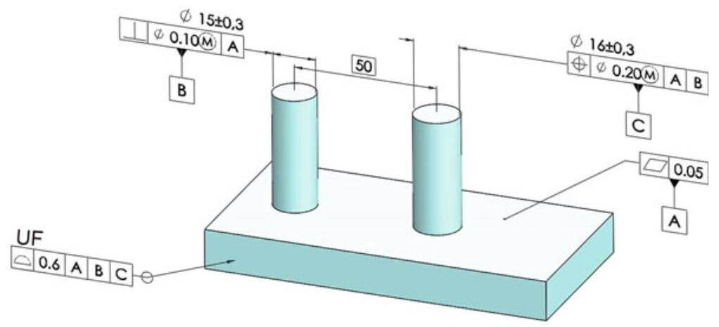 Fig. 6.31 Complete dimensioning of a component with the 3 established functional datums. The primary datum is qualified with a planarity tolerance and the secondary one with a perpendicularity tolerance. Finally, the two holes in the plate are located with a location tolerance with respect to the three established datums