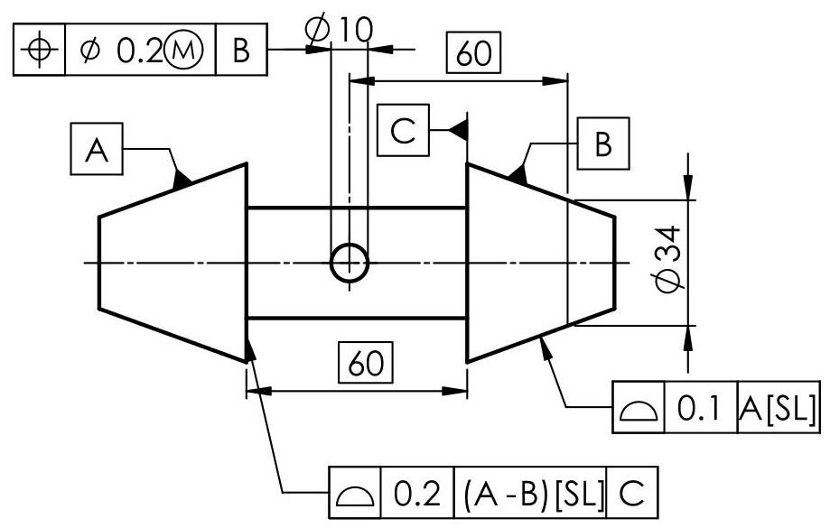 Only datum A in Fig. 6.70 is used to orient and locate the tolerance zone relative to one of the situation features of the associated cone (only the axis of the associated cone). Datum B is used to orient and locate the tolerance zone of the 10mm hole to the situation features of the associated cone, that is, the axis of the cone and a particular point along this axis, defined by the location. When a complementary indication (SL, PL or PT) applies to all the elements of the collection of surfaces of a common datum, the sequence of letters that identify the common datum should be indicated within parentheses.