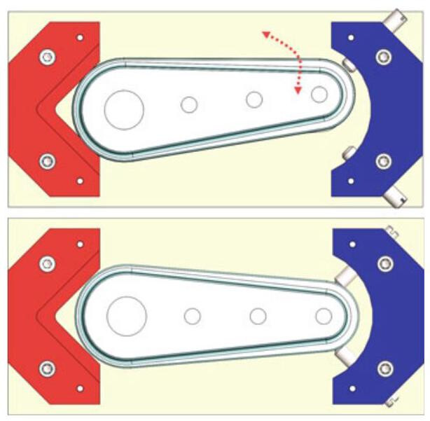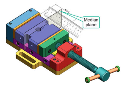 The intention of the design is to allow a simulated datum target (Moveable Datum Target Simulator) to translate or move along a specified direction. By default, a Moveable Datum Target Simulator can translate perpendicularly to the contact surface, but another translation direction may be specified in the drawing and indicated with the theoretically exact dimensions. In our case,the movement direction is at 45° with respect to the median plane of the workpiece.