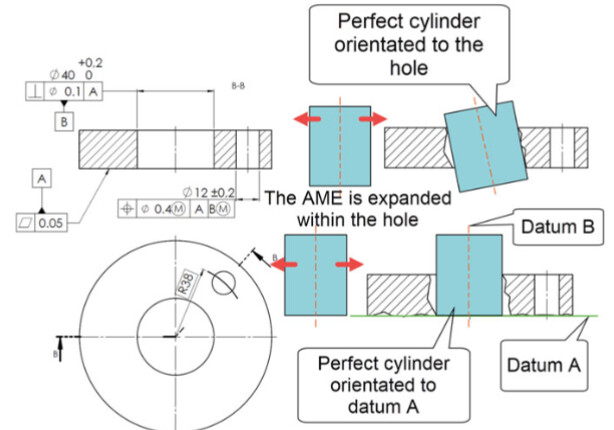 In short, it is necessary to pay a great deal of attention to the characterisation of the simulated theoretical cylinder (which the ASME standards define as Actual Mating Envelope, AME). In the simplest case, the cylinder is orientated according to the axis of the imperfect hole, but when the axis of the hole is defined on the basis of one or two datums, the simulated cylinder (Related Actual Mating Envelope) is arranged according to the DRF or Datum Reference Frame.