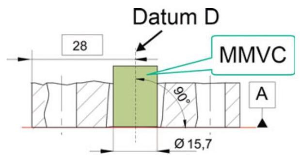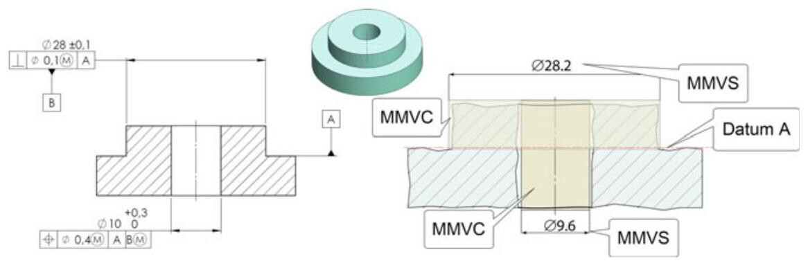MMVC 28.2mm ,which is obtained by summing the geometrical tolerance with the maximum material dimension, MMS. At the same time, the extracted feature of the toleranced internal feature should not violate the MMVC (MMVS 9.6mm ) oriented with respect to datum A and located at 0mm from the axis of the MMVC of datum feature B.