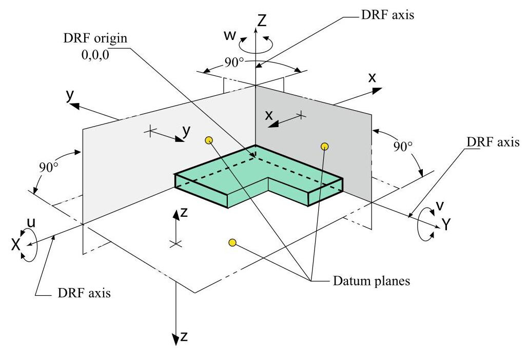 Datums in the ASME standard have the task of defining the DRF (Datum Reference Frame), that is, the 3 perpendicular plane datum system that defines the origin for the measurements and allows a workpiece to be blocked during an inspection or during working operations. A primary datum eliminates three degrees of freedom (2 rotational, that is, u and v, and one linear, z). A secondary datum eliminates two degrees of freedom, (linear y and rotational w). Finally, a tertiary datum eliminates the last degree of freedom, that is, of translation x. In short, a datum system is defined to restrict some degrees of freedom related to its use.