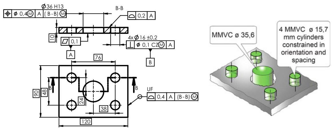 Fig. 6.64 The control of the central hole takes place through an orientation with respect to datum A and coaxially with respect to datum B. The extracted feature of the toleranced internal feature should not violate the MMVC (MMVS 9.6mm ) and the extracted feature of datum feature B should not violate the MMVC (MMVS 28.2mm )