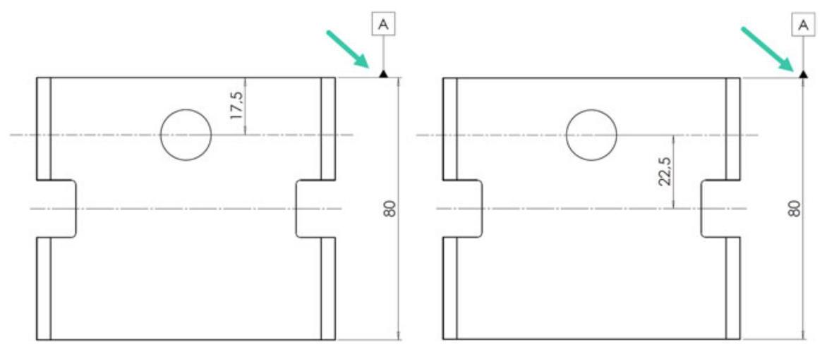 Fig. 6.12 Indications of a datum feature: the dashed leader line indicates that the datum is on the other side (when the considered surface is hidden)