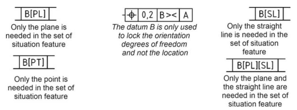 When a datum system is used in a geometrical specification, the situation feature of the tolerance zone is oriented or located on the basis of the datum system defined in the datum section of the tolerance indicator. However, it is possible to vary the number of degrees of freedom eliminated from the datums, according to the design requirements, by utilising PL, SL, PT, >< modifiers after the indication of the datum and enclosing them in square brackets (Fig. 6.68). The complementary indications [PL], [SL] and [PT] are only used when the situation feature of a plane, a straight line or a point is needed, respectively.