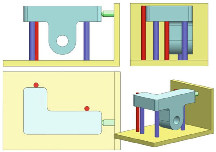 Fig. 6.83 Control equipment for a workpiece that is in contact with the true geometric counterparts for datum features. The datum targets defined by points are simulated by pins with spherical heads. The datum targets defined by lines are simulated by the straight lines of a cylindrical pin. Finally, the datum targets of areas are defined by a pin with a flat head