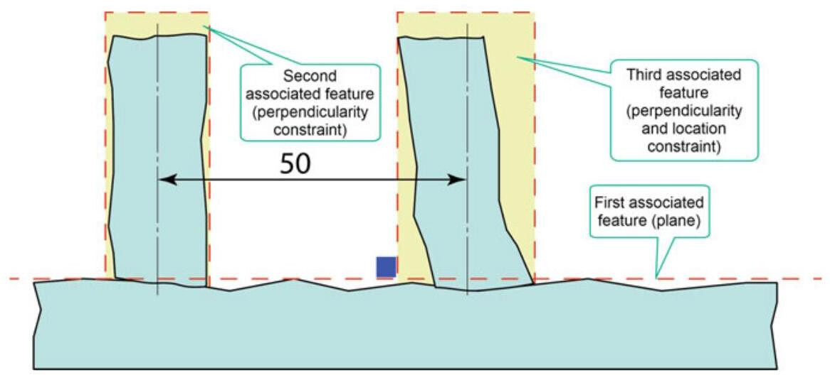 The associated features, used to establish the datums, simulate contact with the real integral features in a way that ensures that the associated feature is outside the material of the non-ideal feature. When the result of this process is ambiguous, then the associated feature must minimise the maximum distance (normal to the associated feature) between the associated feature and the filtered feature (Fig. 6.7).