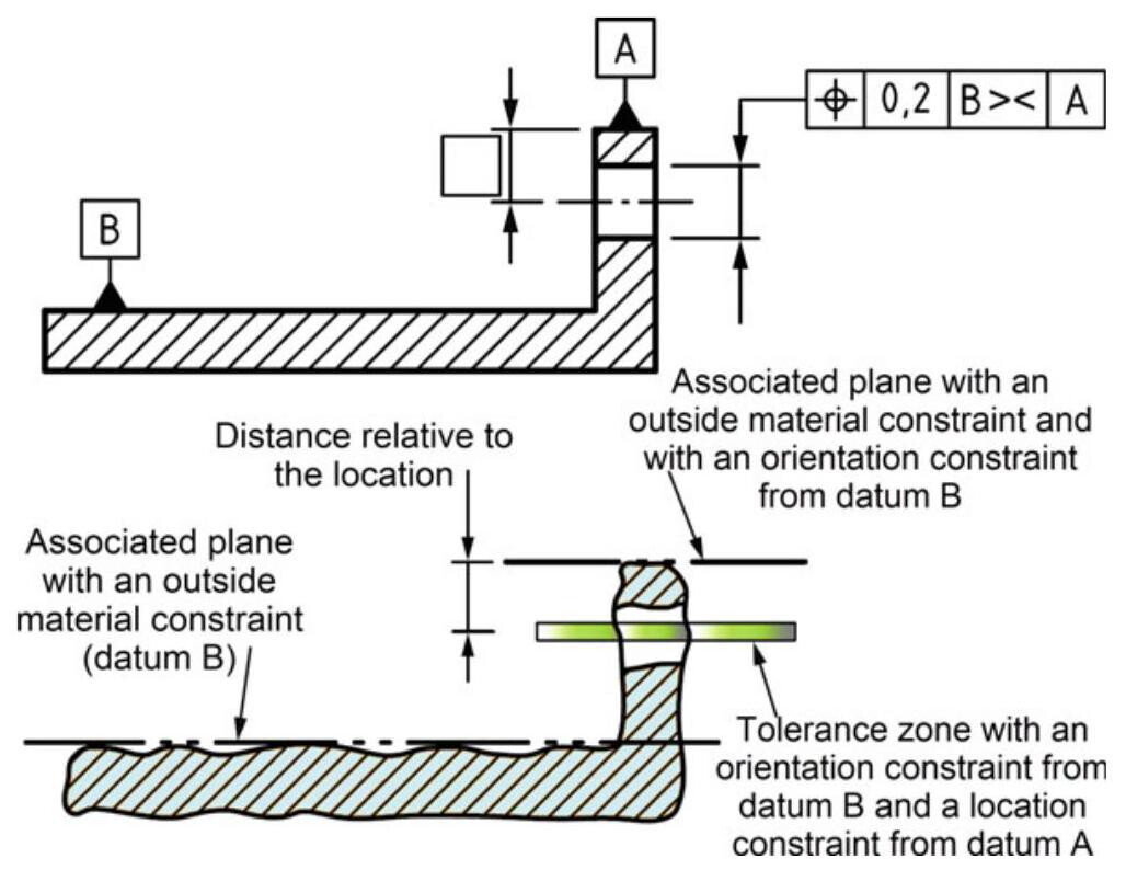 Fig. 6.69 Example of a datum with the >< modifier. Datum B should orientate and locate the tolerance zone (constrained by three degrees of freedom). The use of the “><” modifier only allows the orientation to be controlled, while the location of the tolerance zone is left to datum A