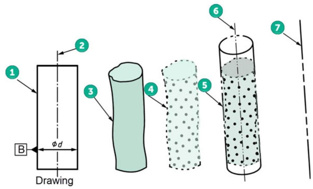 Fig. 6.8 The association and derivation process used to obtain a datum axis from a cylinder: 1. Nominal integral feature. 2. Nominal derived feature. 3. Real integral surface of the workpiece (datum feature). 4. Extracted integral feature; 5. Association with an ideal cylinder. 6. Derived feature (axis of the associated cylinder). 7. Datum (situation feature)