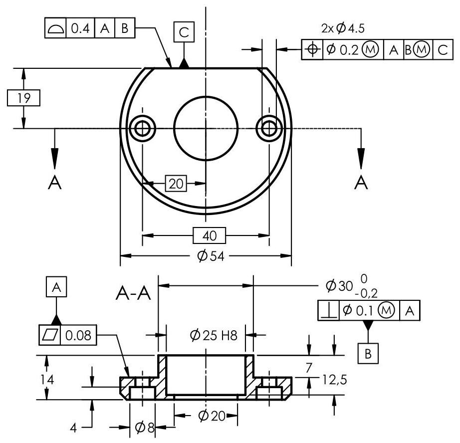 The control equipment is visible in Fig. 6.83; datum plane A is simulated by means of 3 pins with a diameter of 40mm ,datum plane B is simulated by the straight lines between the two pins and datum C is defined by the conical tip of the equipment. Each datum target is located by means of a theoretically exact dimension to indicate that it is necessary to apply the same degree of precision as the control system. Therefore, all the dimensions that locate the datum targets refer to the datum target simulators of the control gauge, and not to the datum features of the workpiece.