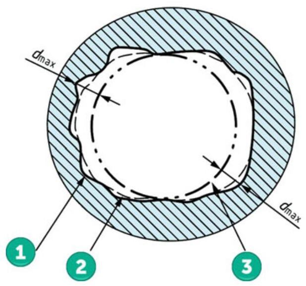 Fig. 6.9 The association method for a cylindrical surface using the minimax criteria. 1. Real integral feature. 2. Filtered feature. 3. Maximum inscribed cylinder