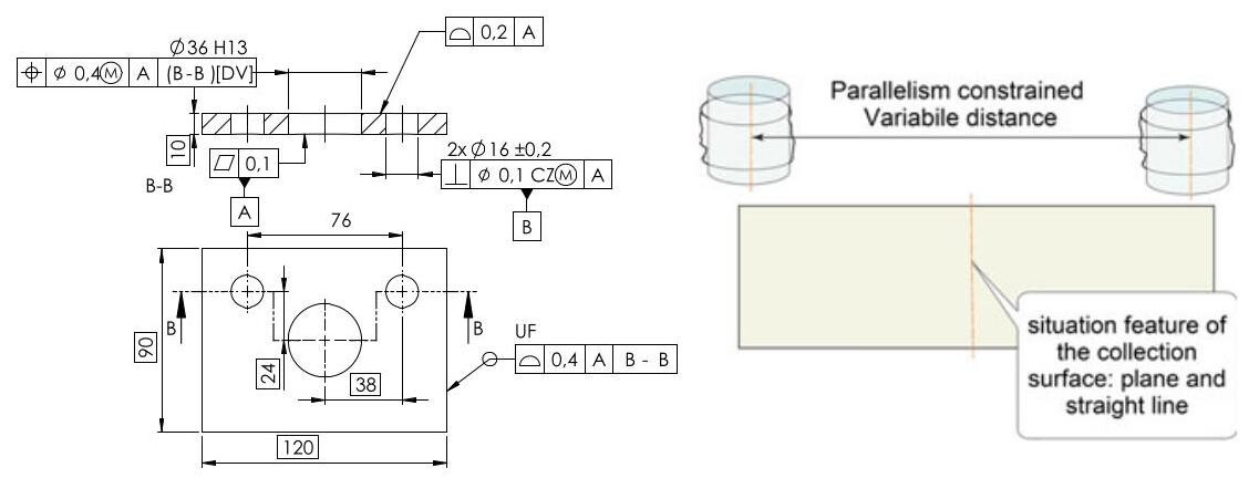 Fig. 6.91 Association of a single datum with a modifier [CF]: the same component as that shown in the previous figure is verified with a different setup. In this case, two tangent cylinders, with the dimensions, orientation and location fixed on the drawing, are used