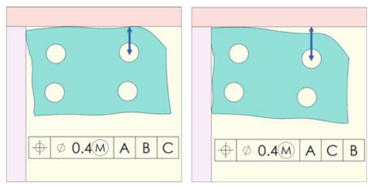 Fig. 6.28 The order of the datums in the tolerance frame indicates the sequence of the inspection operations; as can be seen, the location dimension of the hole changes according to the datum plane on which the workpiece is placed