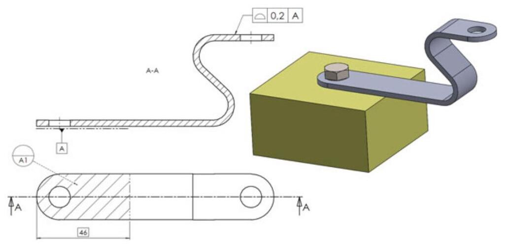 Fig. 6.30 The feature that is used to orientate the workpiece is made up of mating surface A (which is defined as the primary datum), while the feature that is considered to locate it is the axis of the two cylindrical features (which is defined as a secondary datum). Finally, the tertiary datum that blocks the workpiece, which is constituted by the milled surface of the component and of the corresponding surface of the plate, is added