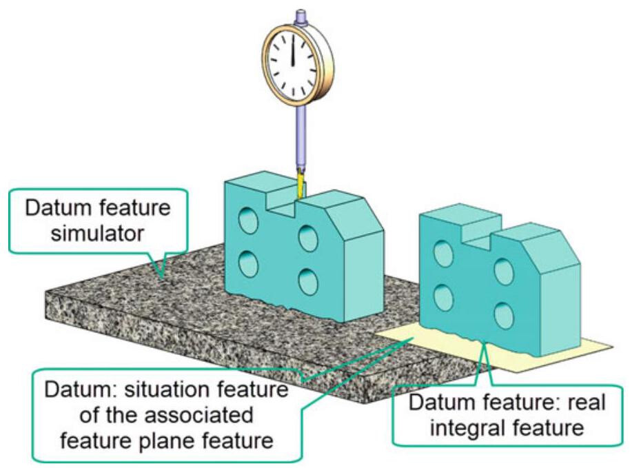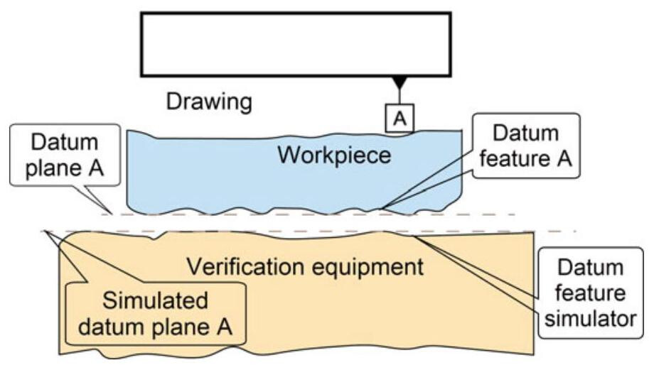 Simulated datums are conceptually perfect (almost physically perfect), and they represent a bridge between the imperfect real world of datum features and the perfect imaginary world of datums. Ultimately, it is opportune to distinguish between the real datum feature of a workpiece (named datum feature) and the datum, that is, the equivalent theoretical datum (plane, axis or centerplane), as simulated by the associated inspection or manufacturing equipment.