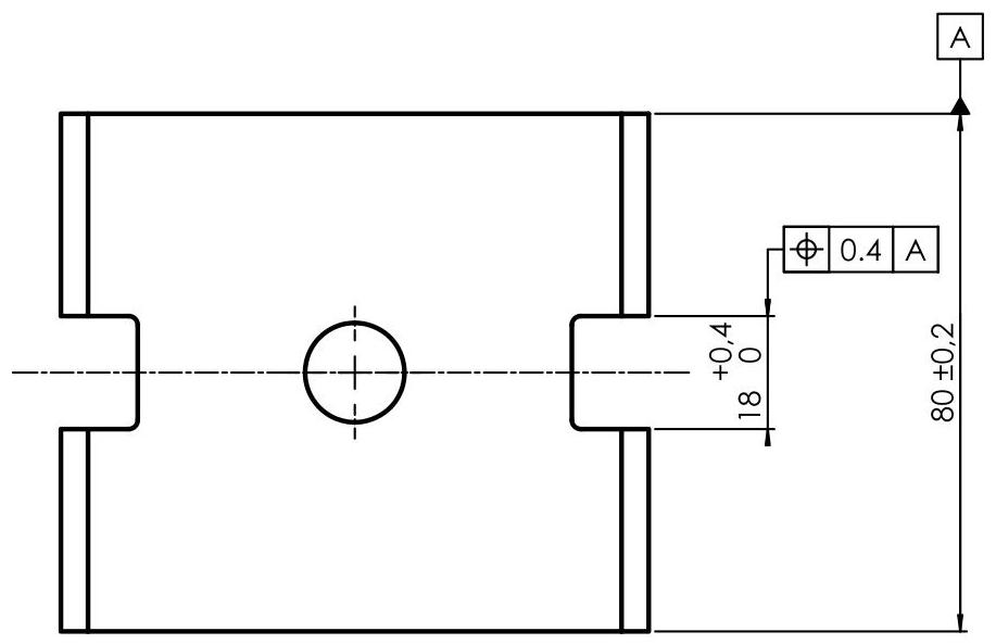 Fig. 6.65 By placing the maximum material modifier next to the indications of datum feature A, the datum becomes the median plane of a block under MMVC conditions (in this case, coinciding with the maximum material dimensions of the slot,that is, 18mm )