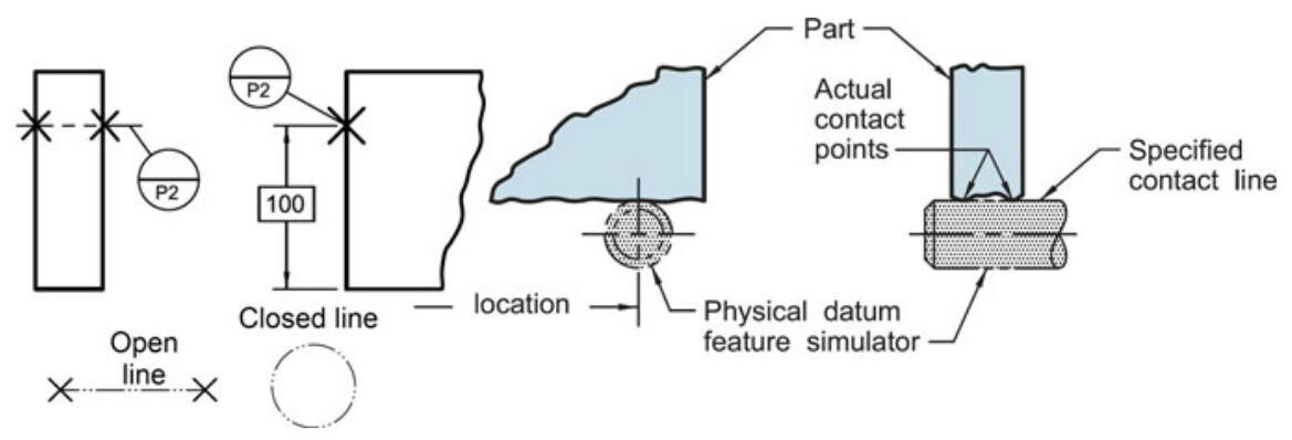 If the datum target is made up of a line, it is indicated with two crosses united by a fine 5.1 double-dashed line which, when this line is not closed (open line), is terminated by two crosses