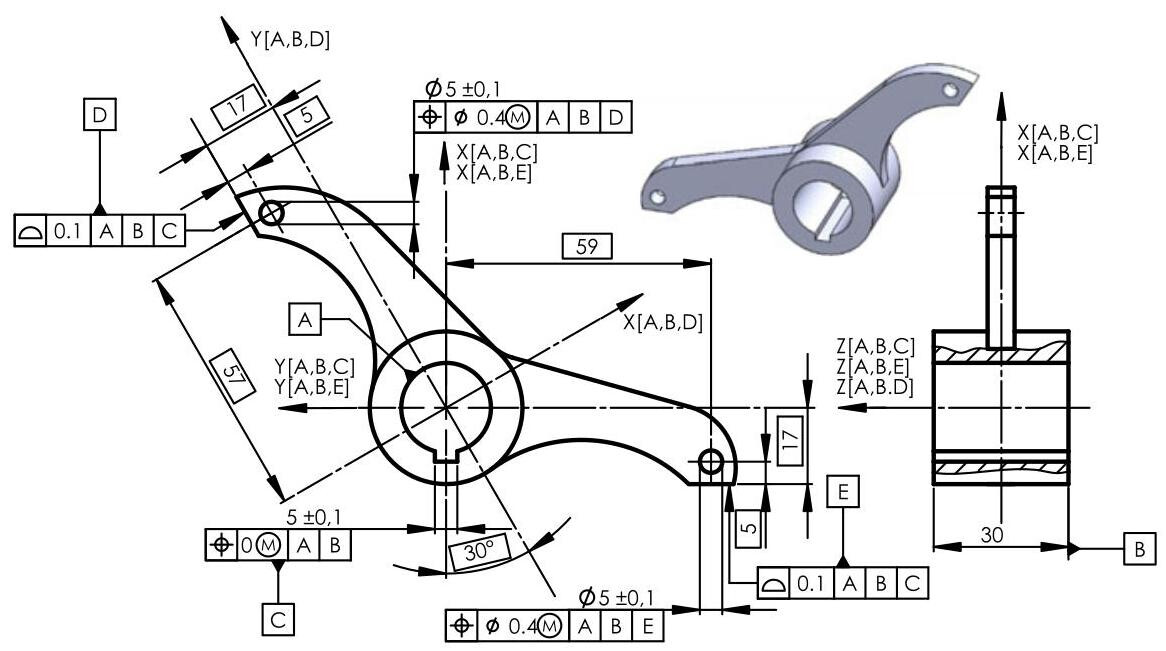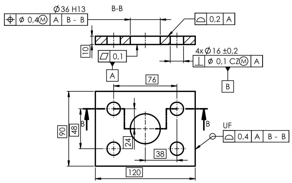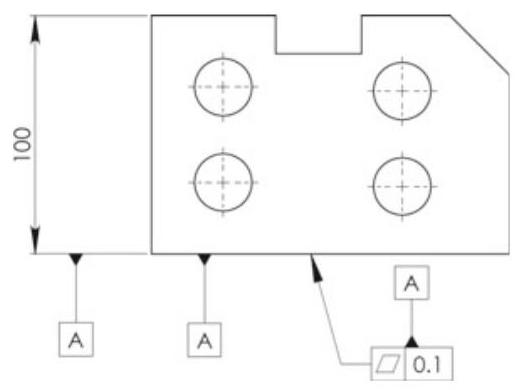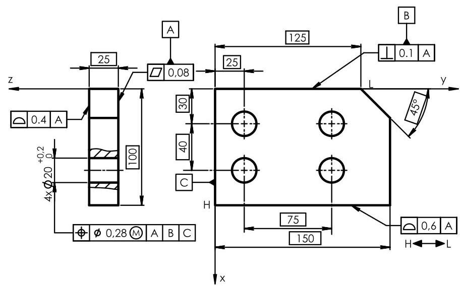 Fig. 6.31 Complete dimensioning of a component with the 3 established functional datums. The primary datum is qualified with a planarity tolerance and the secondary one with a perpendicularity tolerance. Finally, the two holes in the plate are located with a location tolerance with respect to the three established datums