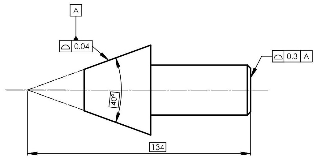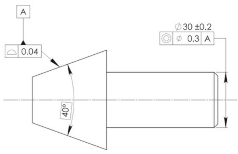 The control equipment is visible in Fig. 6.83; datum plane A is simulated by means of 3 pins with a diameter of 40mm ,datum plane B is simulated by the straight lines between the two pins and datum C is defined by the conical tip of the equipment. Each datum target is located by means of a theoretically exact dimension to indicate that it is necessary to apply the same degree of precision as the control system. Therefore, all the dimensions that locate the datum targets refer to the datum target simulators of the control gauge, and not to the datum features of the workpiece.