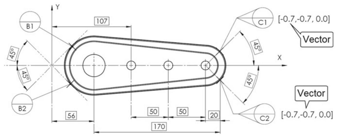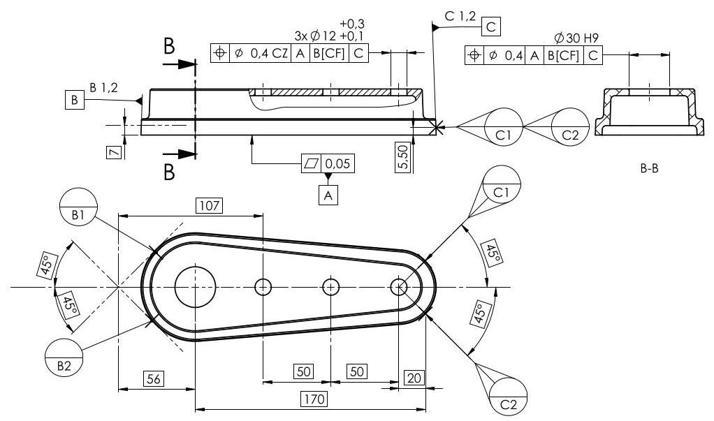 Fig. 6.85 The CF symbol, placed next to the datum feature B indications, defines an ideal feature (V block), which is different from the feature indicated on the drawing and associated to it with a “contact” operation. The two moveable datum target modifiers C1 and C2 are used to define the direction in which the location of the datum target is not fixed