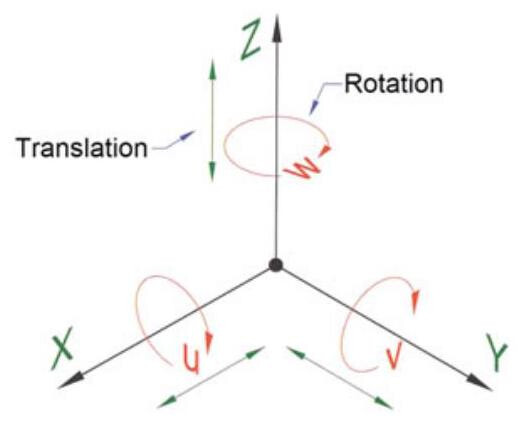 Fig. 6.23 The six degrees of freedom of a workpiece: any movement in the space can be attributed to three possible translations in the direction of the datum axes X, Y and Z and to three rotations, u, v and w, around the same axes