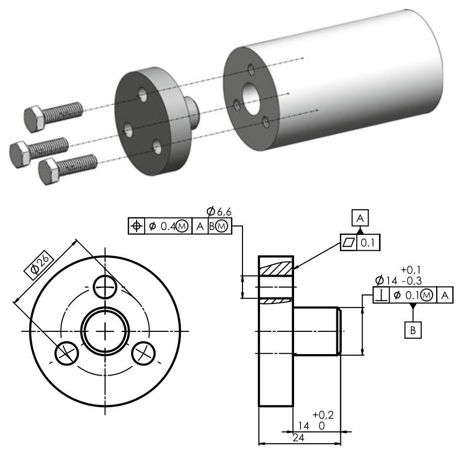 Fig. 6.64 The control of the central hole takes place through an orientation with respect to datum A and coaxially with respect to datum B. The extracted feature of the toleranced internal feature should not violate the MMVC (MMVS 9.6mm ) and the extracted feature of datum feature B should not violate the MMVC (MMVS 28.2mm )