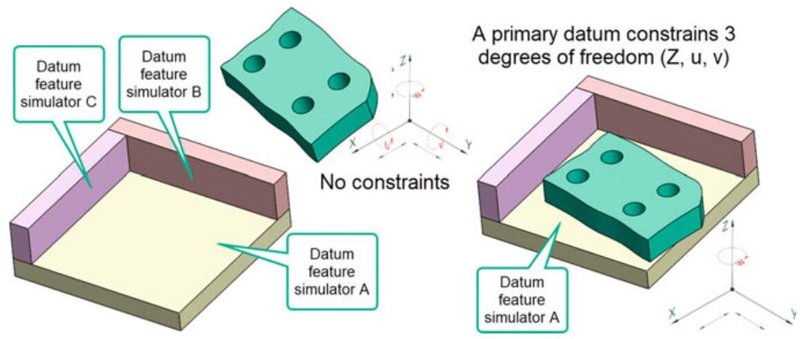 Datums in the ASME standard have the task of defining the DRF (Datum Reference Frame), that is, the 3 perpendicular plane datum system that defines the origin for the measurements and allows a workpiece to be blocked during an inspection or during working operations. A primary datum eliminates three degrees of freedom (2 rotational, that is, u and v, and one linear, z). A secondary datum eliminates two degrees of freedom, (linear y and rotational w). Finally, a tertiary datum eliminates the last degree of freedom, that is, of translation x. In short, a datum system is defined to restrict some degrees of freedom related to its use.
