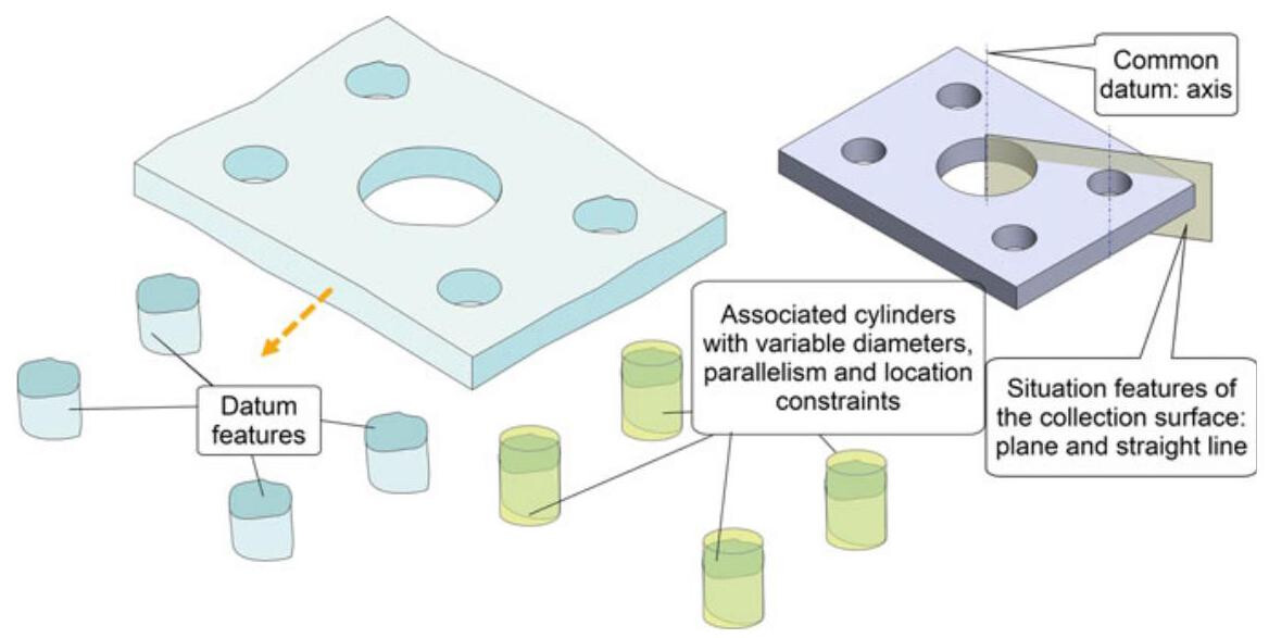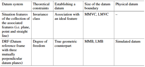 A datum consists of a set of situation features for an ideal feature (feature of perfect form) associated with the identified datum features of a workpiece. Since these ideal features have the task of blocking the degrees of freedom of the tolerance zones, the geometrical type of these associated features should be one of the invariance classes reported in Table 6.1.
