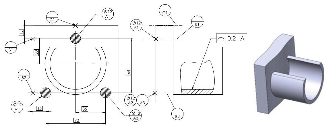 Identification of the feature that locates the workpiece in the assembly, in order to establish the secondary datum; datum feature B that locates the workpiece is represented by the axis of the two cylindrical features.