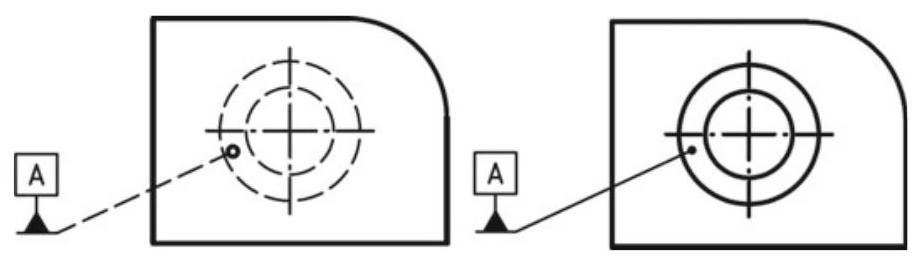 Fig. 6.12 Indications of a datum feature: the dashed leader line indicates that the datum is on the other side (when the considered surface is hidden)