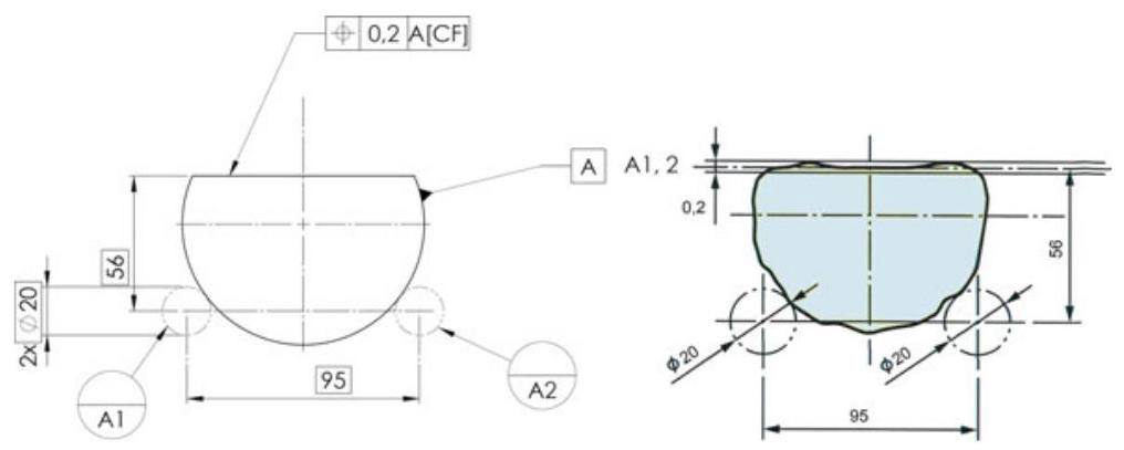 Fig. 6.91 Association of a single datum with a modifier [CF]: the same component as that shown in the previous figure is verified with a different setup. In this case, two tangent cylinders, with the dimensions, orientation and location fixed on the drawing, are used