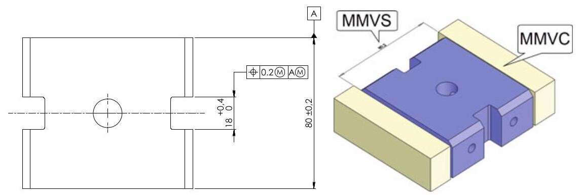 MMVC 28.2mm ,which is obtained by summing the geometrical tolerance with the maximum material dimension, MMS. At the same time, the extracted feature of the toleranced internal feature should not violate the MMVC (MMVS 9.6mm ) oriented with respect to datum A and located at 0mm from the axis of the MMVC of datum feature B.