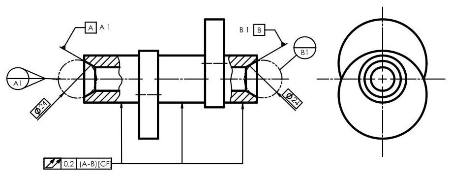 Fig. 6.88 A perfect distinction between the indication of the datum feature (truncated conic surface) and contacting features A1 and A2, simulated by two 24 mm spheres, is obtained by means of the indications of contact feature CF. Explicit reference to the datum target, through the A1 and B1 indications next to the A and B labels, should also be noted
