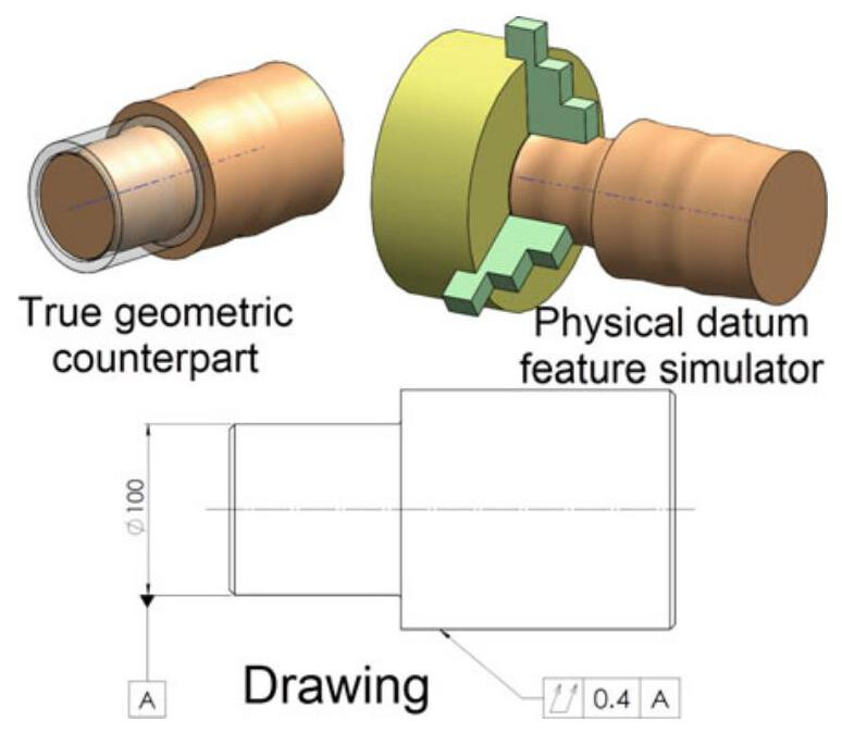 Simulated datums are conceptually perfect (almost physically perfect), and they represent a bridge between the imperfect real world of datum features and the perfect imaginary world of datums. Ultimately, it is opportune to distinguish between the real datum feature of a workpiece (named datum feature) and the datum, that is, the equivalent theoretical datum (plane, axis or centerplane), as simulated by the associated inspection or manufacturing equipment.