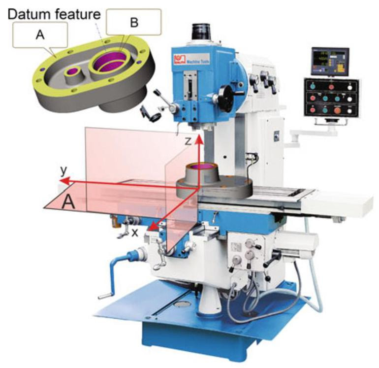 The datum system of a tool machine is shown in Fig. 6.16: the production equipment has the task of aligning the features of the workpiece with the datums of the machine (for example, datum feature A is aligned with the clamping machine and datum feature B is made to coincide with the z axis). In short, no datums exist on a workpiece, but they are simulated by the datum feature system of the tool machine.