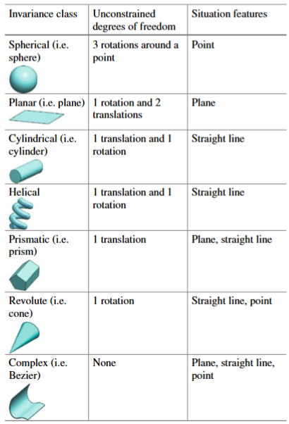In Table 6.1, all the surfaces are classified into seven classes on the basis of the degrees of freedom for which the surface is invariant. Situation features (point, straight line, plane) are defined for each class of surface.