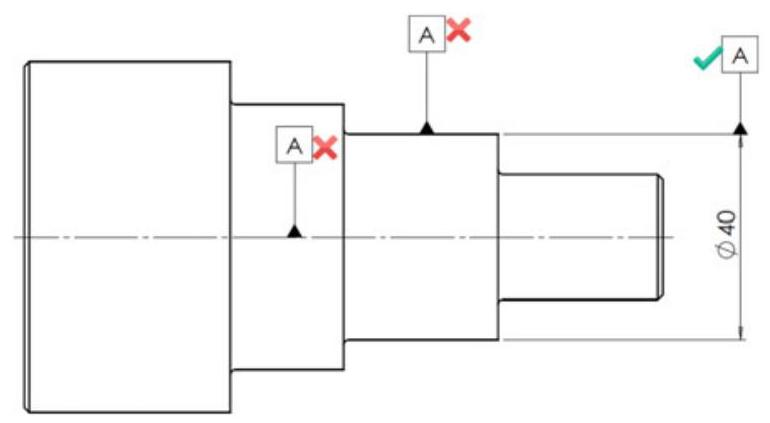 It is necessary to pay particular attention to the correct indication of a datum applied to a feature of size on a drawing: the line of the symbol should coincide with the dimension line of the datum feature, and the indication errors shown in Fig. 6.14 should be avoided.