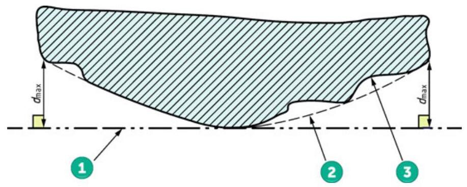 Fig. 6.7 The association method for a planar surface using the minimax criteria. 1. Outside the material tangent plane (datum). 2. Filtered feature. 3. Real integral feature