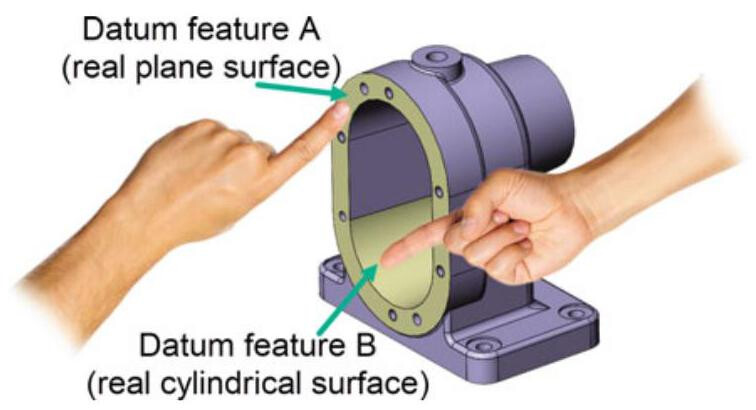 Fig. 6.2 Datum features are particular physical features of real, imperfect, labelled workpieces that have the purpose of constraining the rotational and translational degrees of freedom of relative parts. Datums are the surfaces of the workpiece that can be touched, and they are suitable for associating to a datum
