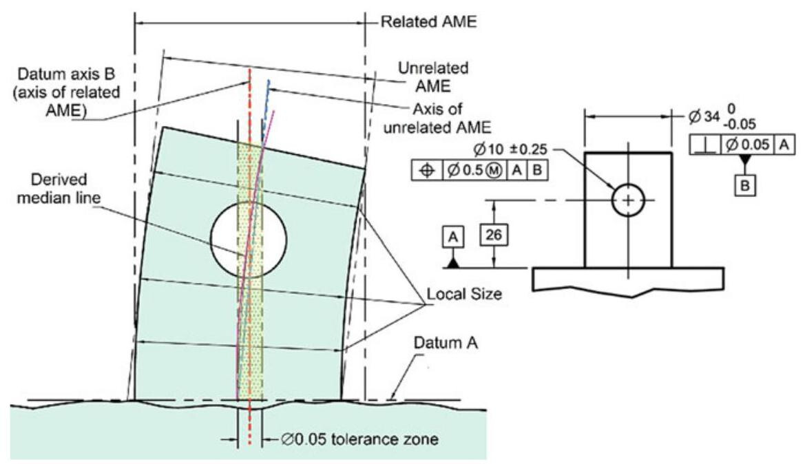 Figure 6.20 further clarifies the meaning of the related and unrelated Actual Mating Envelopes: datum A is a plane,while datum B is the axis of a 34mm cylinder,orientated with an error of 0.05mm with respect to plane A; the 10mm hole is located with respect to datums A and B. The axis of the feature of size is obtained from the smallest restricted orientated cylinder (the unrelated actual mating envelope) and it is useful to verify a perpendicularity error with respect to datum A. The smallest circumscribed cylinder perpendicular to A (the related actual mating envelope) is used to determine the axis of datum B. The derived centerplane is a curve made up of the central points of the transversal section perpendicular to the axis of the feature of size, and it is used to determine the straightness error.