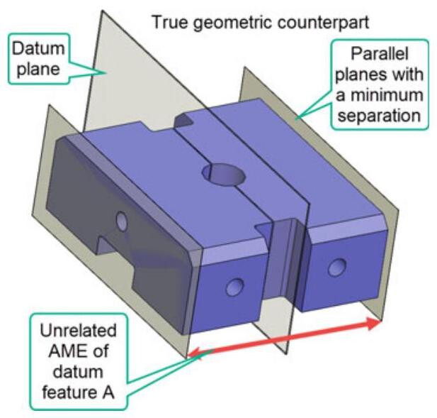 The true geometric counterpart is the theoretically perfect boundary used to establish a datum from a specified datum feature. True geometric counterparts have a perfect form, and a basic orientation and location relative to other true geometric counterparts for all the datum references in a feature control frame. Furthermore, the true geometric counterparts are adjustable in size, when the datum feature applies an RMB (Regardless Material Boundary), and are fixed at the designated size, when an MMB (Maximum Material Boundary) or an LMB (Least Material Boundary) is specified.