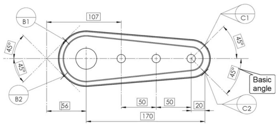 Let us consider, for example, the drawing of the component shown in Fig. 6.85, produced for moulding, in which datum feature A is the support plane, the second datum is made up of two datum targets, that is, B1 and B2, while the symbols of the two moveable target datums, C1 and C2, are used for the third datum.