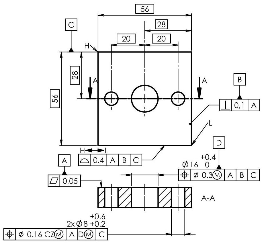 The case of the dimensioning of the plate in Fig. 6.62 should be considered: the 16mm central hole is referenced with respect to a datum reference frame constituted by three planes, that is, A, B and C, and in turn constitutes a datum feature D (Diameter 16mm ) of the two 8mm holes that are located with respect to the A,D and C datum system.