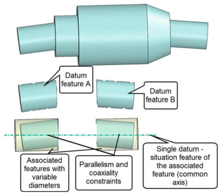 The associated features, used to establish the datums, simulate contact with the real integral features in a way that ensures that the associated feature is outside the material of the non-ideal feature. When the result of this process is ambiguous, then the associated feature must minimise the maximum distance (normal to the associated feature) between the associated feature and the filtered feature (Fig. 6.7).