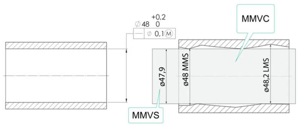 When a geometrical control is applied to a feature of size, it is possible to use the maximum material requirement (MMR), with the advantages that are derived from the increase in the tolerances, as can be seen in Fig. 7.10. The combined effect of the size error and the straightness error generates a virtual size (MMVS), which represents the worst possible mating condition.