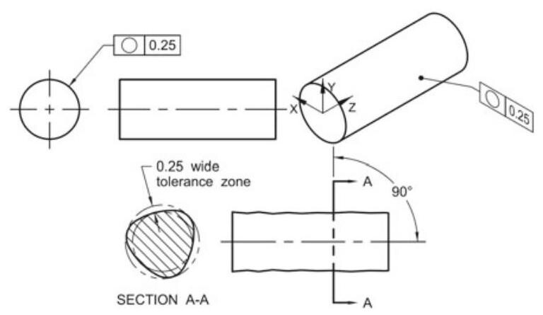 A roundness tolerance specifies a bi-dimensional zone limited by two coaxial circles placed at a distance which is radially equal to the specified tolerance.