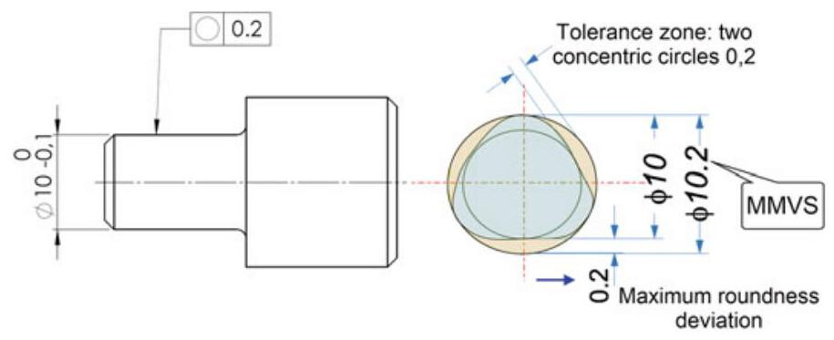 In the same way as for the flatness case, it is advisable, as a general rule, to choose a tolerance of a value that is less than half that of the dimensional tolerance; moreover, it is not possible to apply a maximum material or least material modifier, in that the roundness tolerance controls the boundary points of a transversal surface, a feature that cannot be sized.