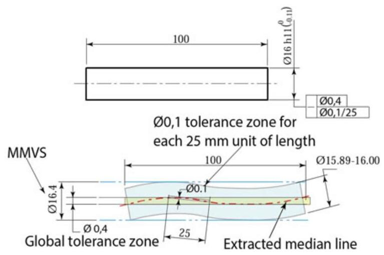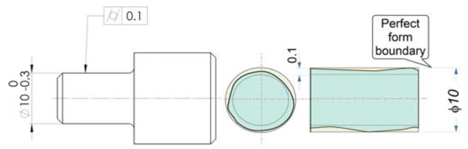 Fig. 7.4 Application of a straightness tolerance to the surface of a shaft. As the principle of independency comes into force by default, the maximum virtual boundary is obtained by summing the maximum material size with the straightness tolerance, which can be greater than the size tolerance